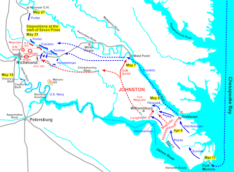 McClellan's strategy and offensive in early 1862 became known as the Peninsula Campaign. It was a roundabout, overcomplicated plan. It involved an amphibious landing near the tip of the peninsula between the James and York rivers and a march to Richmond from the east, with the hope of circumventing the main Confederate army. It failed to achieve these immediate aims. McClellan immediately ran into Confederate troops and moved slowly upon landing. Faulty intelligence and McClellan's own pessimism greatly exaggerated the number of these opposing forces. Such estimates were used to justify a slow march, giving the Confederates plenty of time to prepare a defense of Richmond.